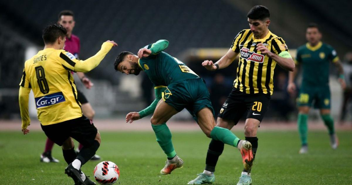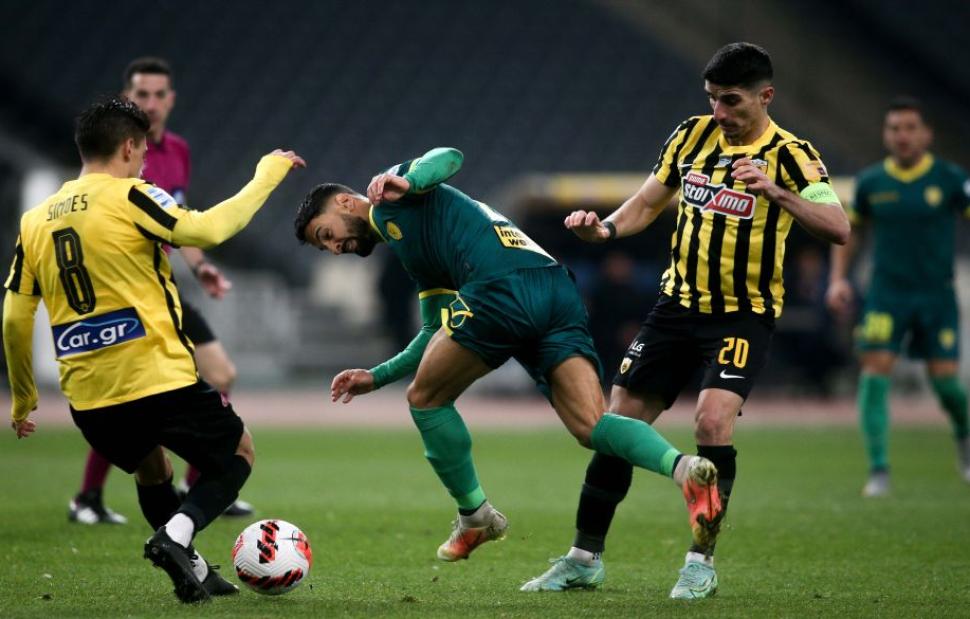 Με αρκετές απουσίες ποδοσφαιριστών ιδιαίτερα επιδραστικών στο παιχνίδι της (Τσούμπερ, Αραούχο), η ΑΕΚ παρουσίασε πολύ μέτρια εικόνα στο α΄ ημίχρονο. Με τον Αμραμπατ σε κακή ημέρα και τον Λιβάι Γκαρσία να μην έχει «μπει» στο ρυθμό του αγώνα, οι γηπεδούχοι δυσκολεύονταν πάρα πολύ στη δημιουργία, παρά την εξαιρετική παρουσία -για ακόμα μία αγωνιστική- του Πέτρου Μάνταλου. Ο αρχηγός ήταν αυτός που δημιούργησε και την πρώτη μεγάλη ευκαιρία, με έξοχη πάσα στον Ανσαριφάρντ στο 36΄, αλλά το σουτ του Ιρανού απέκρουσε εντυπωσιακά ο Μελίσσας.