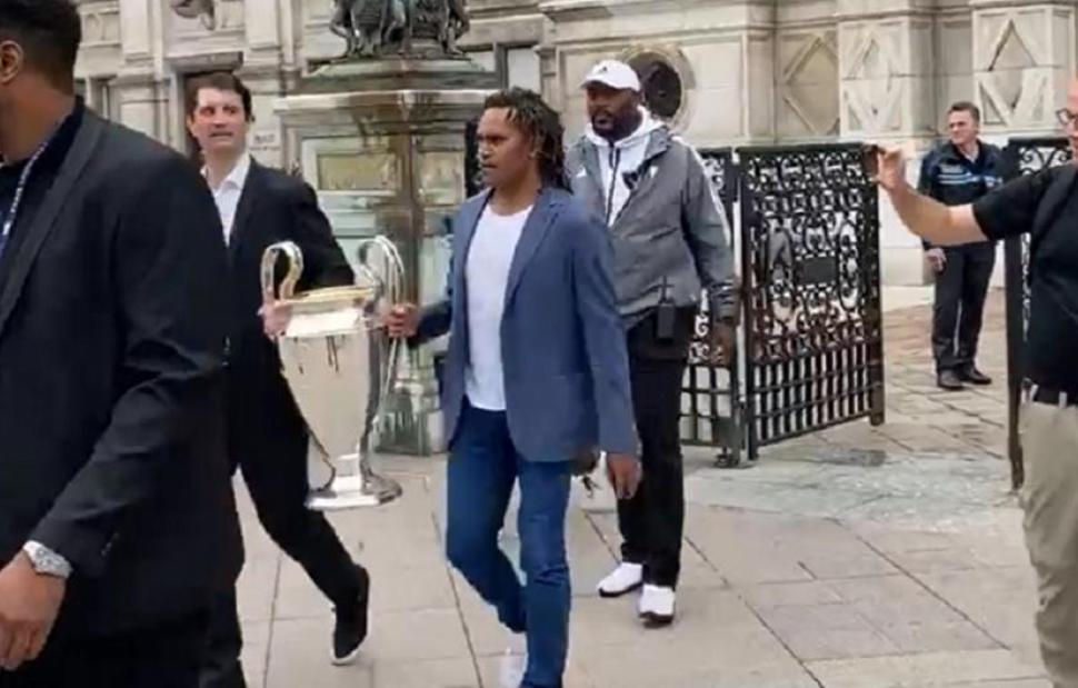 The @ChampionsLeague trophy has arrived!! Being carried in by ex Real Madrid star Christian Karembeu. 😳 pic.twitter.com/YgHhmY9dqq