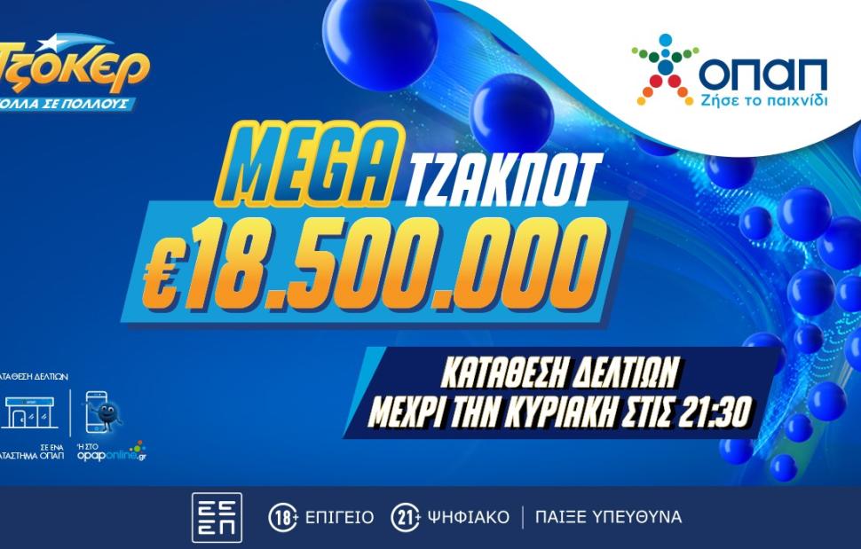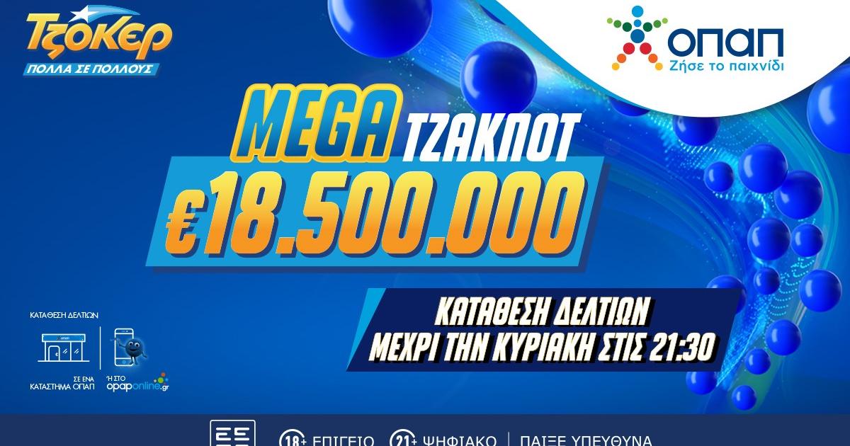 Η κλήρωση για τα 18,5 εκατ. ευρώ θα διεξαχθεί απόψε στις 22:00 με τις συμμετοχές να ολοκληρώνονται μισή ώρα νωρίτερα, στις 21:30. Όποιος επιθυμεί μπορεί να την παρακολουθήσει ζωντανά από το κανάλι του ΟΠΑΠ στο YouTube.\