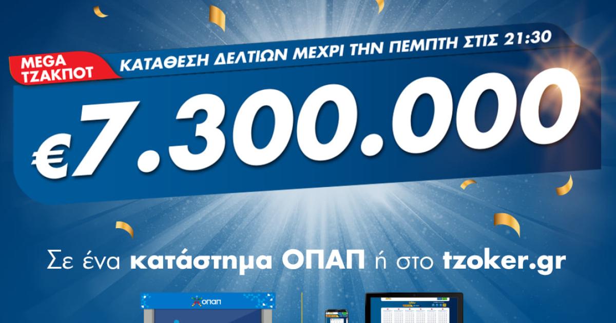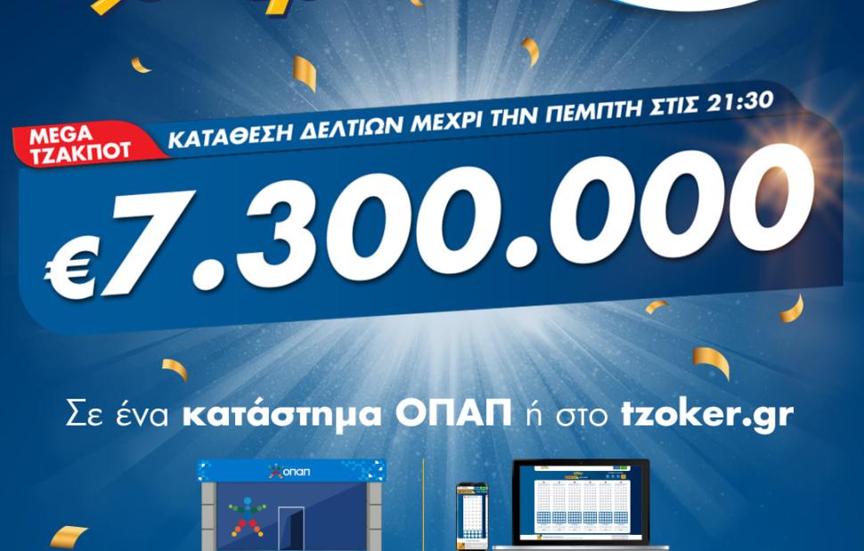 Το ποσό των 7,3 εκατ. ευρώ κληρώνει απόψε το mega τζακ ποτ του ΤΖΟΚΕΡ. Η μεγάλη κλήρωση θα πραγματοποιηθεί στις 22:00 και θα μεταδοθεί ζωντανά μέσα από το Facebook, το κανάλι του ΟΠΑΠ στο YouTube, το tzoker.gr και το tzoker app.