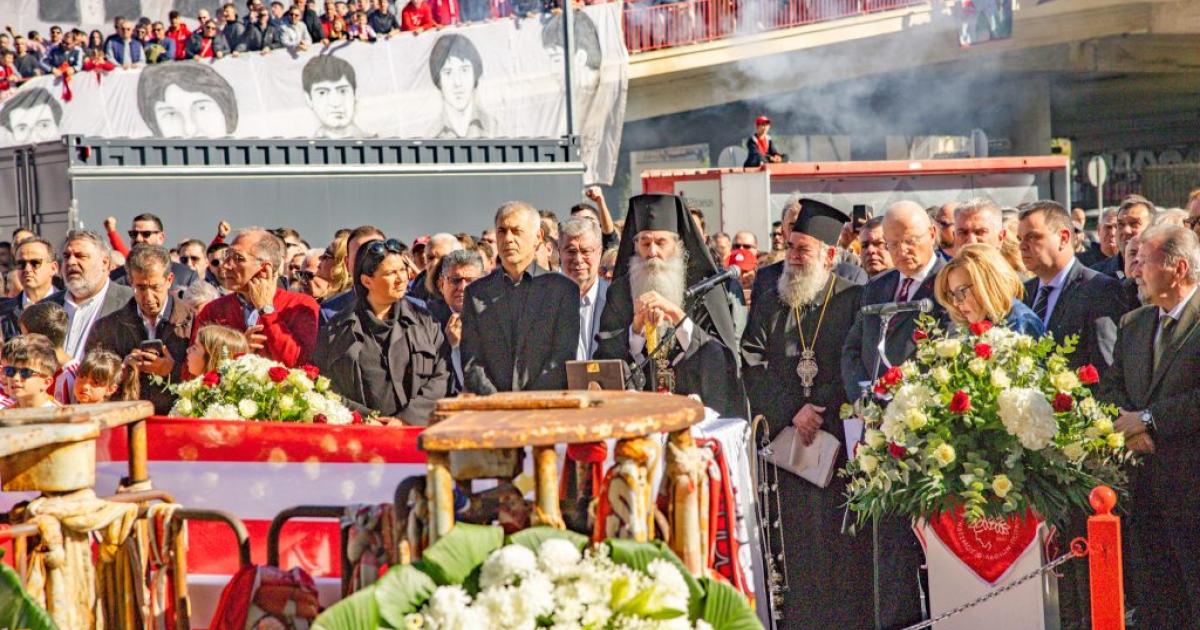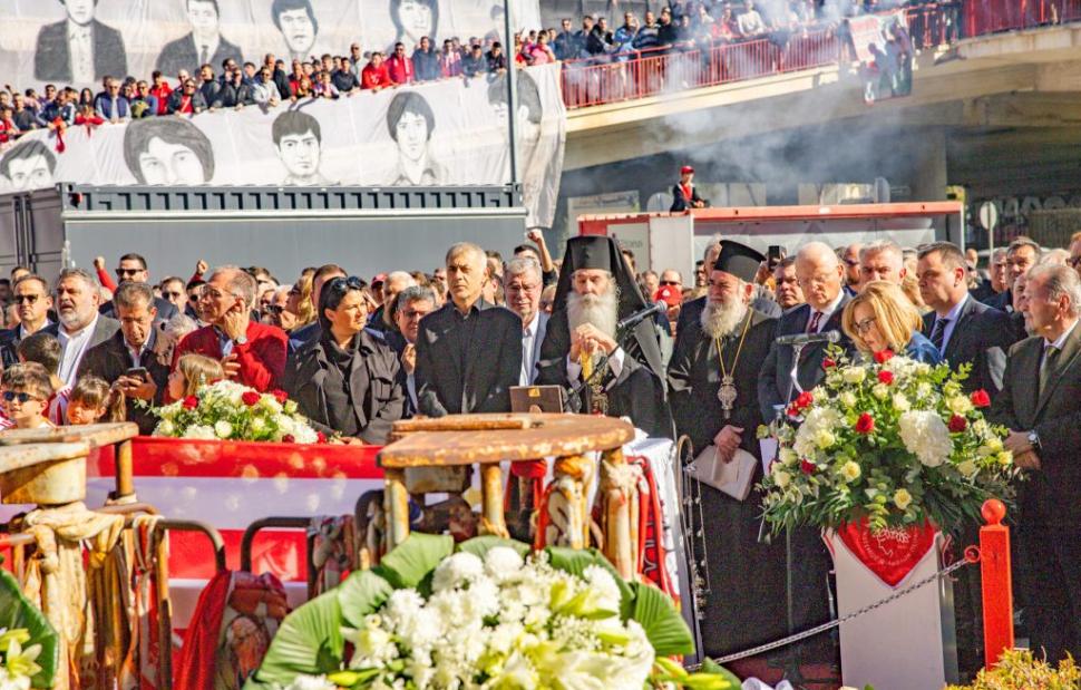 Η επιμνημόσυνη δέηση που τέλεσε ο Σεβασμιώτατος Μητροπολίτης Πειραιώς και Φαλήρου κ.κ. Σεραφείμ, πραγματοποιήθηκε παρουσία του Δημάρχου Πειραιά, Γιάννη Μώραλη, του Προέδρου της ΠΑΕ Ολυμπιακός, Ευάγγελου Μαρινάκη, των Προέδρων της ΚΑΕ Ολυμπιακός, Παναγιώτη και Γιώργου Αγγελόπουλου, του Προέδρου του Ερασιτέχνη Ολυμπιακού Μιχάλη Κουντούρη, μελών της Διοίκησης της ΠΑΕ Ολυμπιακός, σύσσωμου του ποδοσφαιρικού τμήματος, όλων των τμημάτων των Ερυθρόλευκων, καθώς και πλήθους κόσμου.