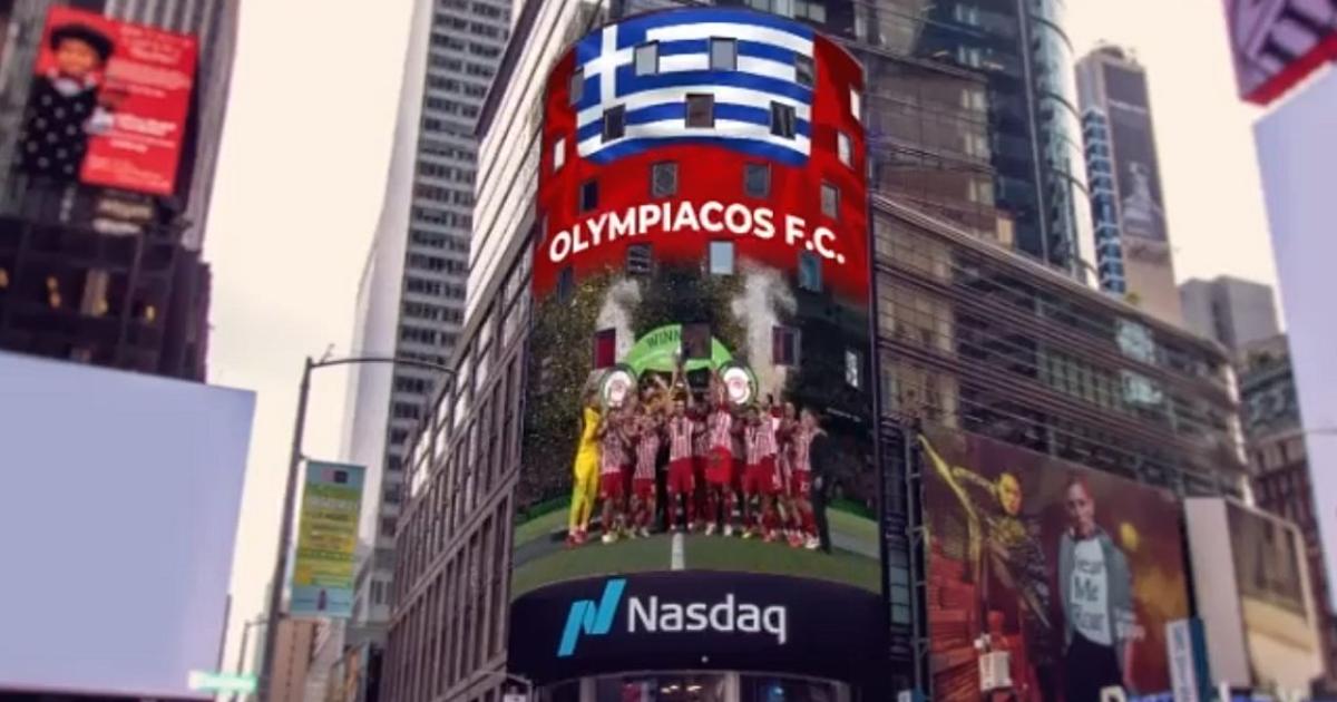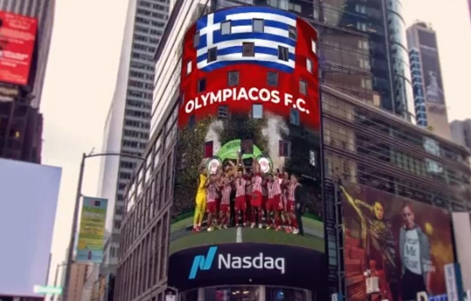 Το Nasdaq billboard έπαιξε στις οθόνες του στην εμβληματική πλατεία της Νέας Υόρκης «Times Square» πλάνα από την απονομή του βαρύτιμου τροπαίου στον Ολυμπιακό και συνεχάρη τους Ερυθρόλευκους για την κατάκτηση του τίτλου.