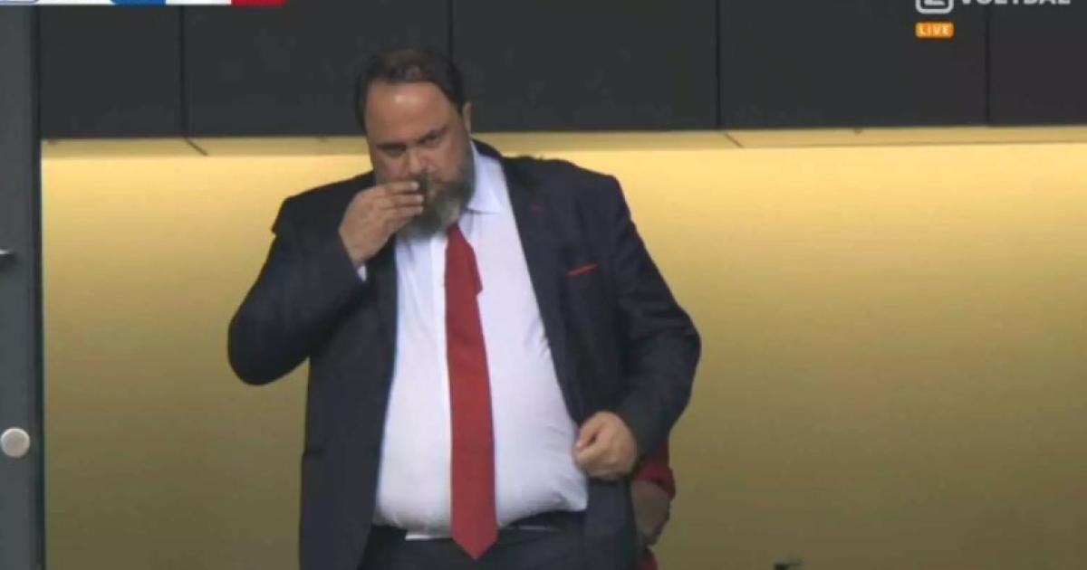Ο Βαγγέλης Μαρινάκης έκανε μάλιστα τον σταυρό του και φίλησε μια μικρή εικόνα που είχε μαζί του, προσευχόμενος να πετύχει η ομάδα του τον στόχο της.