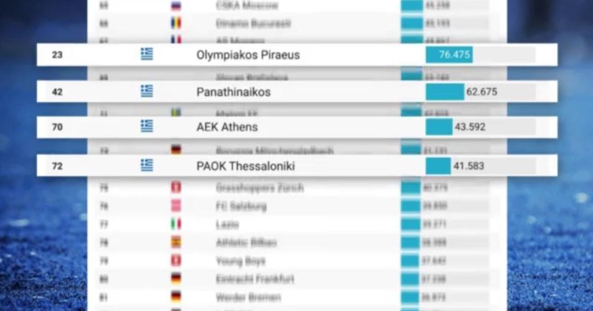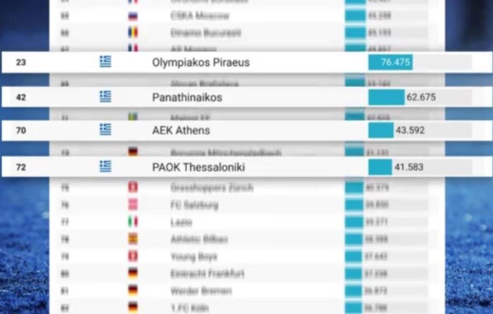 Ο Παναθηναϊκός βρίσκεται στην 42η θέση με 62.675 β., ενώ ακολουθούν η ΑΕΚ στην 70η θέση και ο ΠΑΟΚ στην 72η.
