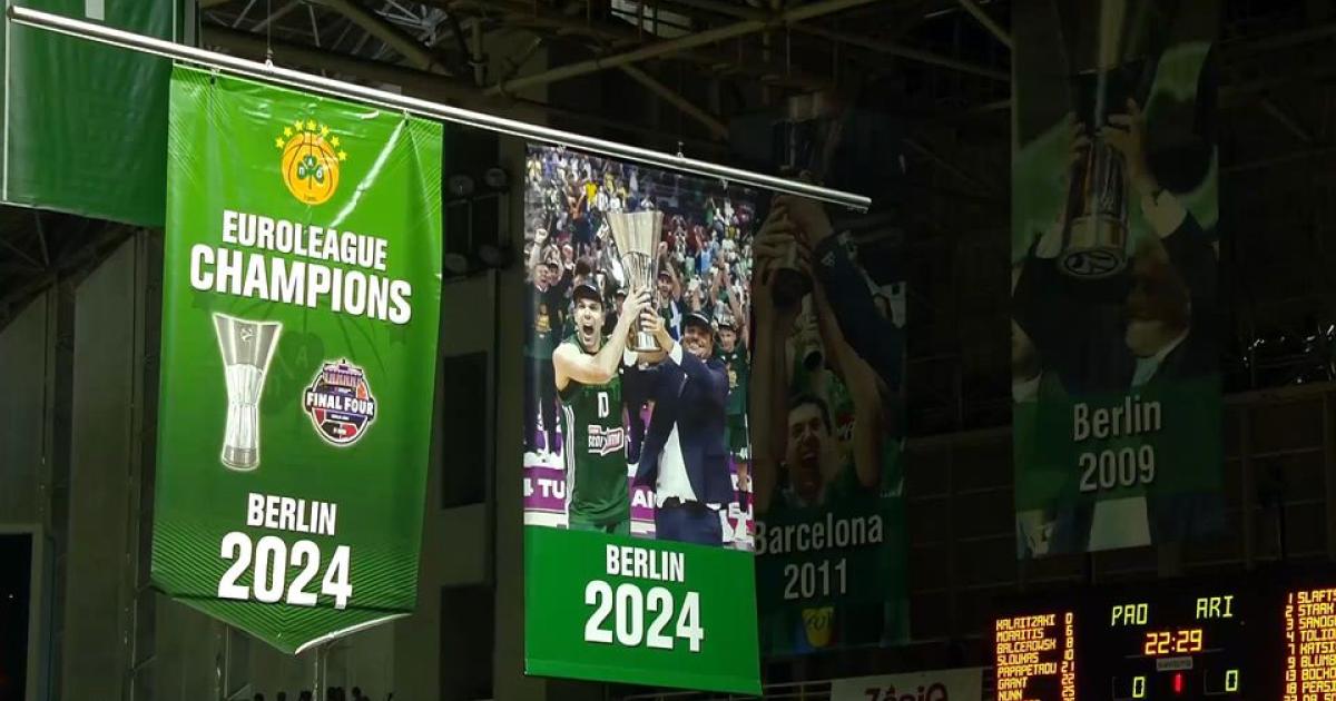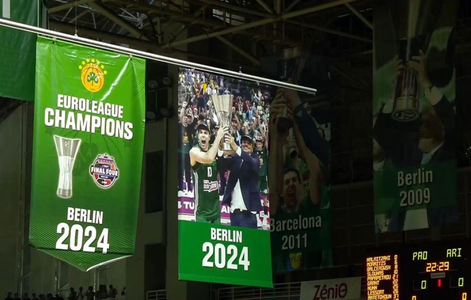 Τέλος, το σχετικό λάβαρο που αναγράφει την κατάκτηση της Euroleague για τη σεζόν 2024 ανέβηκε στην οροφή του κλειστού μαζί με τις υπόλοιπες διακρίσεις του Παναθηναϊκού.