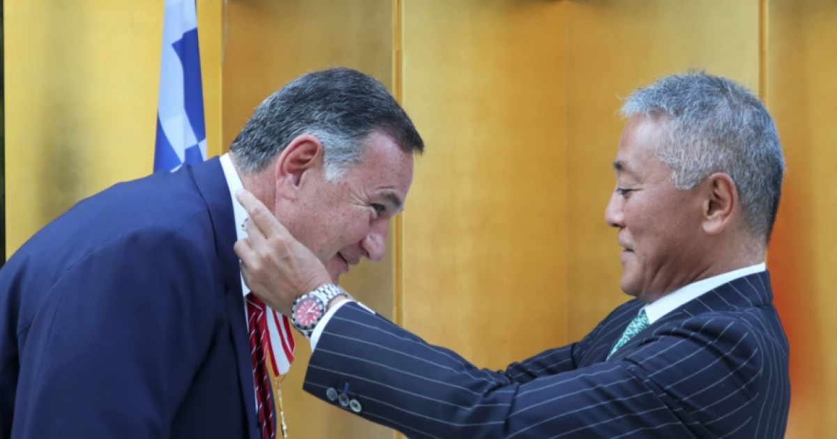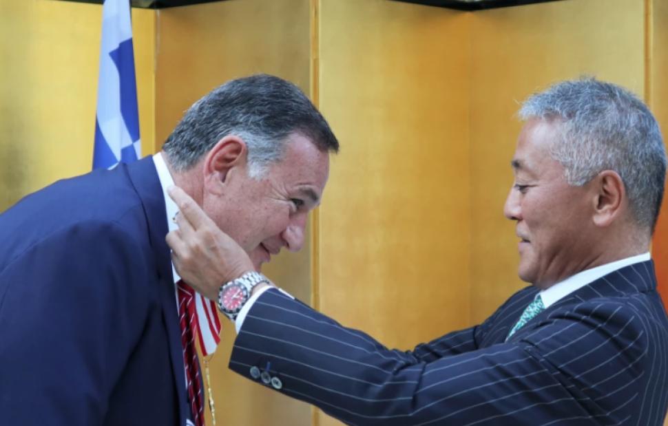 Το Παράσημο του Τάγματος του Ανατέλλοντος Ηλίου, Χρυσών Ακτινών μετά Ταινίας, απονεμήθηκε από τον πρέσβη της Ιαπωνίας στην Ελλάδα, Γιασουνόρι Νακαγιάμα στον πρόεδρο της ΕΟΕ, σε ειδική τελετή στην οικία του πρέσβη.