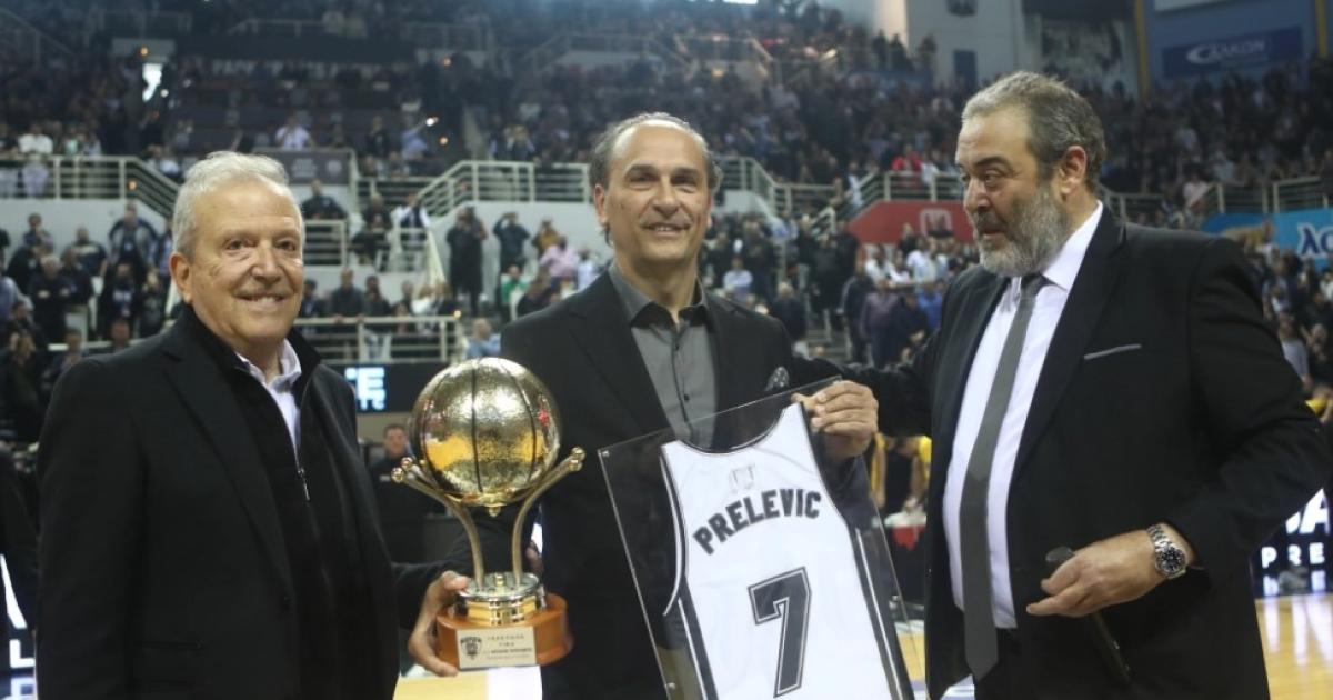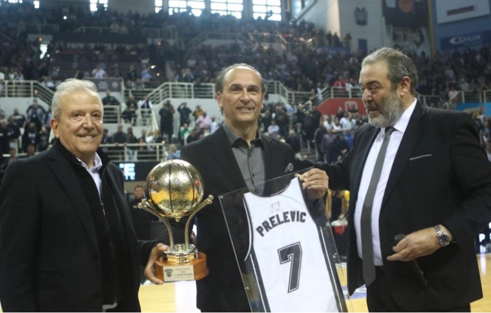 Ο Θανάσης Χατζόπουλος τίμησε τον Μπάνε Πρέλεβιτς δίνοντάς του μια χρυσή μπάλα του μπάσκετ και ο Νίκος Βεζυρτζής ένα μίνι αντίγραφο της φανέλας του.