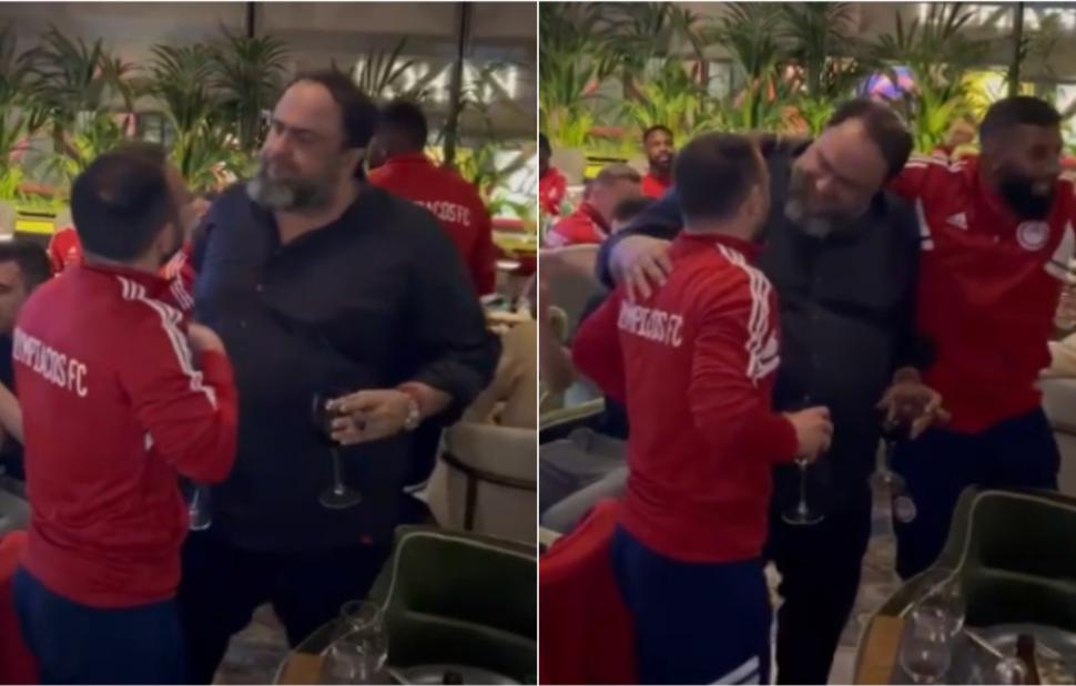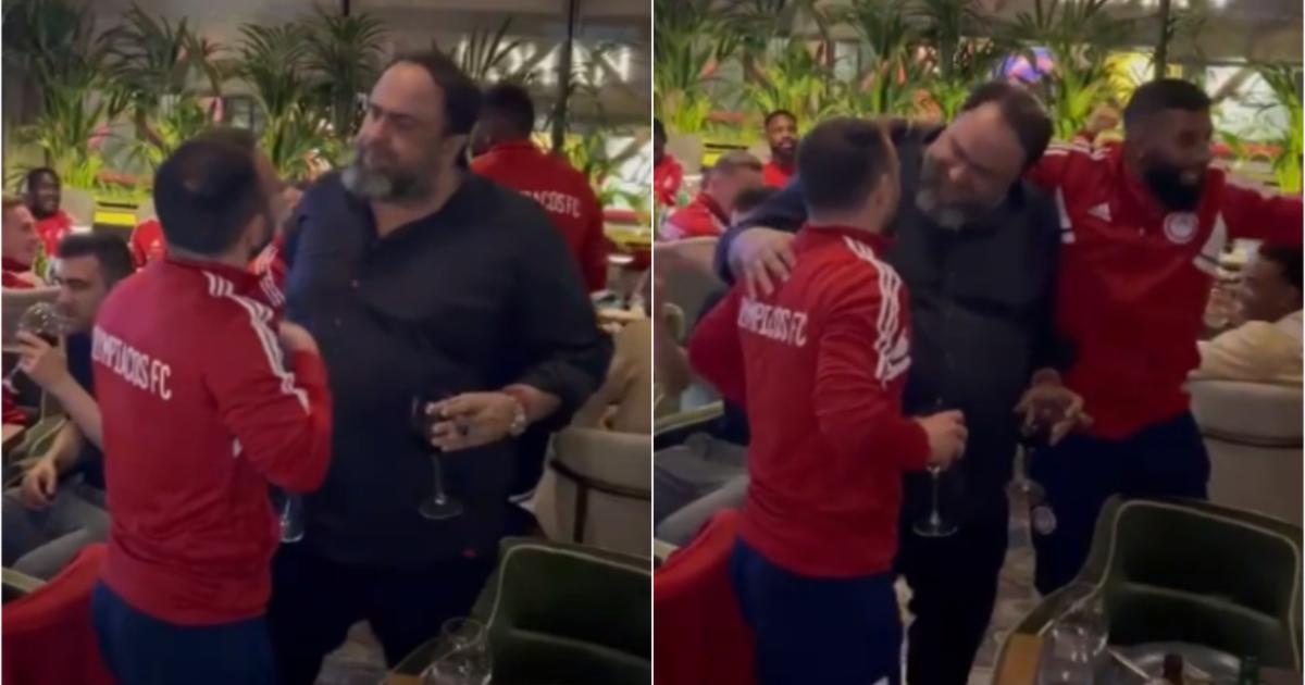 Πανευτυχής για τη μεγάλη νίκη επί της ΑΕΚ ήταν και ο πρόεδρος της ομάδας Βαγγέλης Μαρινάκης, ο οποίος έκανε το δείπνο σε παίκτες και προπονητές, στο εστιατόριο «Καλά Καθούμενα» στο Γκάζι.