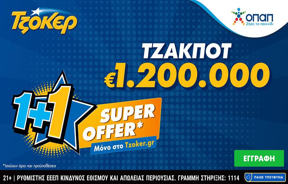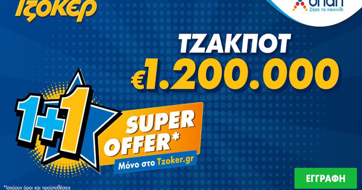 Τουλάχιστον 1,2 εκατ. ευρώ έχουν την ευκαιρία να διεκδικήσουν απόψε οι παίκτες του ΤΖΟΚΕΡ. Η κατάθεση δελτίων για συμμετοχή στην κλήρωση μπορεί να γίνει μόλις με μερικά κλικ μέσω του διαδικτύου, μπαίνοντας στο tzoker.gr ή στην εφαρμογή ΤΖΟΚΕΡ. Μάλιστα, όσοι επιλέξουν να παίξουν ΤΖΟΚΕΡ online θα συναντήσουν την προσφορά «Super Offer 1+1». Κάνοντας login στον λογαριασμό τους, στο tzoker.gr ή στην εφαρμογή ΤΖΟΚΕΡ, οι παίκτες μπορούν να μάθουν περισσότερα για τη συγκεκριμένη προσφορά, για την οποία ισχύουν όροι και προϋποθέσεις.