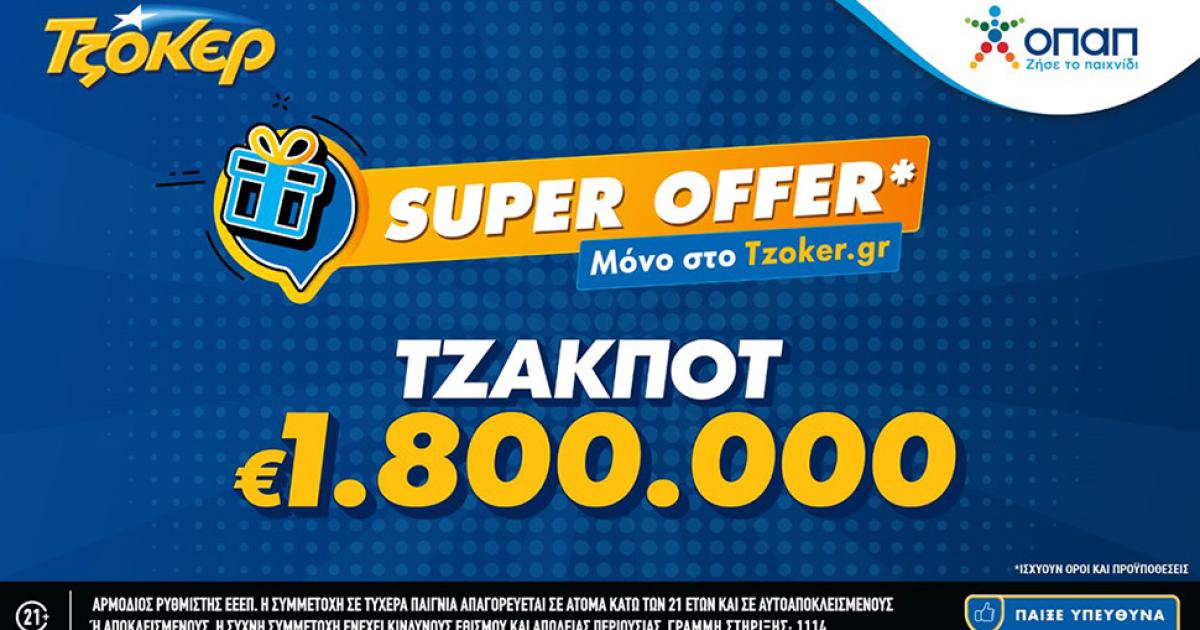 Τουλάχιστον 1,8 εκατ. ευρώ έχουν την ευκαιρία να διεκδικήσουν απόψε οι παίκτες του ΤΖΟΚΕΡ, μετά το 5ο συνεχόμενο τζακ ποτ που σημειώθηκε στην κλήρωση της Πέμπτης. Μάλιστα, μία «Super Offer»* περιμένει όλους όσοι επιλέξουν να καταθέσουν τα δελτία τους online. Μπαίνοντας στον λογαριασμό τους, στο tzoker.gr ή στην εφαρμογή ΤΖΟΚΕΡ, οι παίκτες μπορούν να μάθουν περισσότερα για τη συγκεκριμένη προσφορά, για την οποία ισχύουν όροι και προϋποθέσεις.