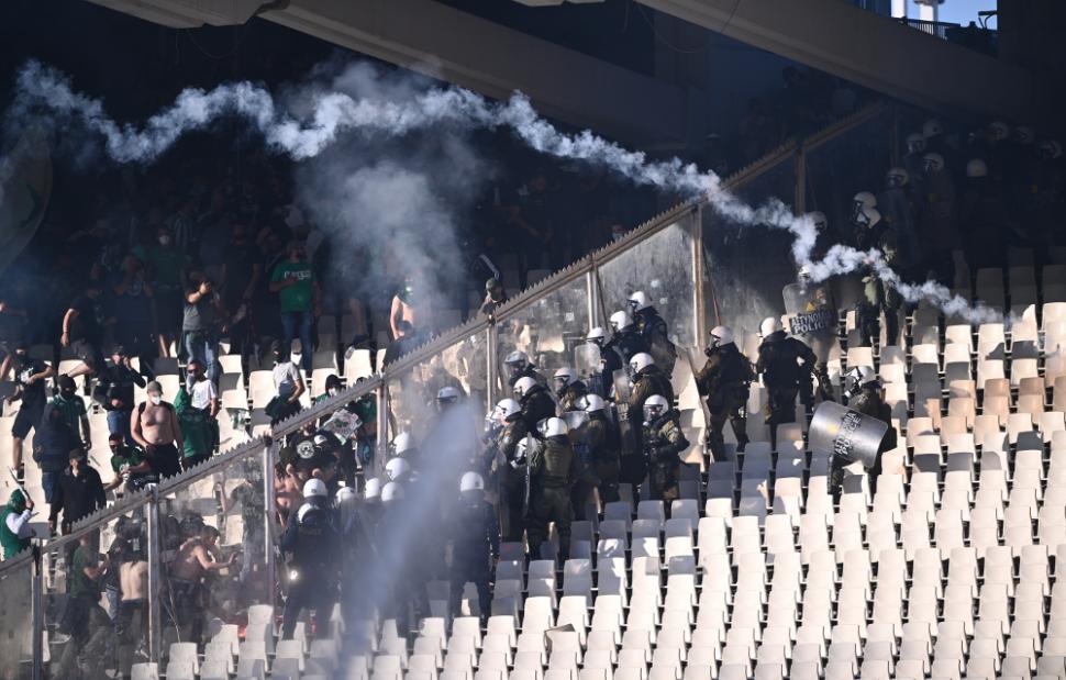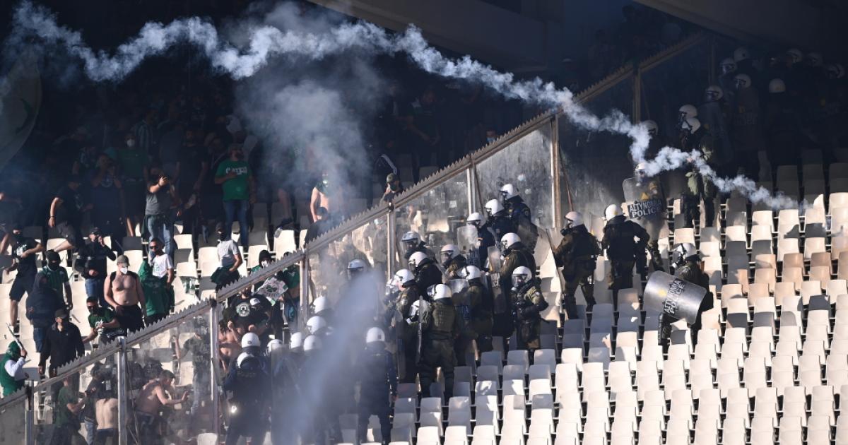 Ορισμένοι οπαδοί του Παναθηναϊκού πέταξαν αντικείμενα ενώ οι αστυνομικοί απάντησαν με χειροβομβίδες κρότου λάμψης.