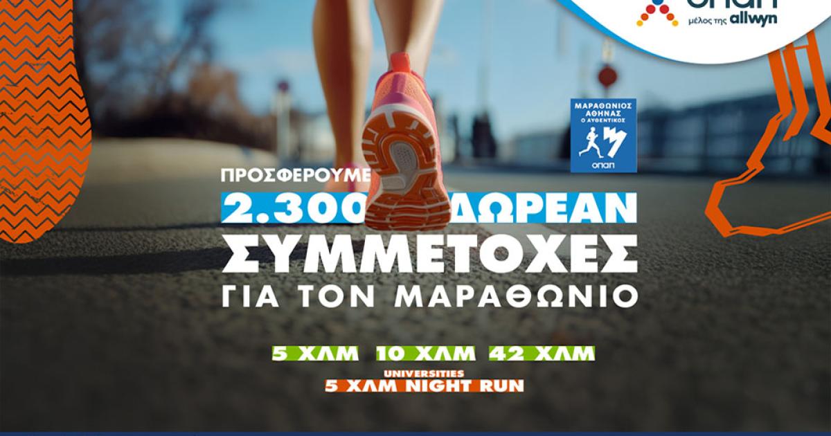 Ο ΟΠΑΠ, Μέγας Χορηγός του Αυθεντικού Μαραθωνίου της Αθήνας, προσφέρει δωρεάν 2.300 συμμετοχές για τον Μαραθώνιο Δρόμο των 42.195 μέτρων, τις διαδρομές των 5 και 10 χιλιομέτρων, καθώς και για τον αγώνα 5 χλμ. Universities Night Run.