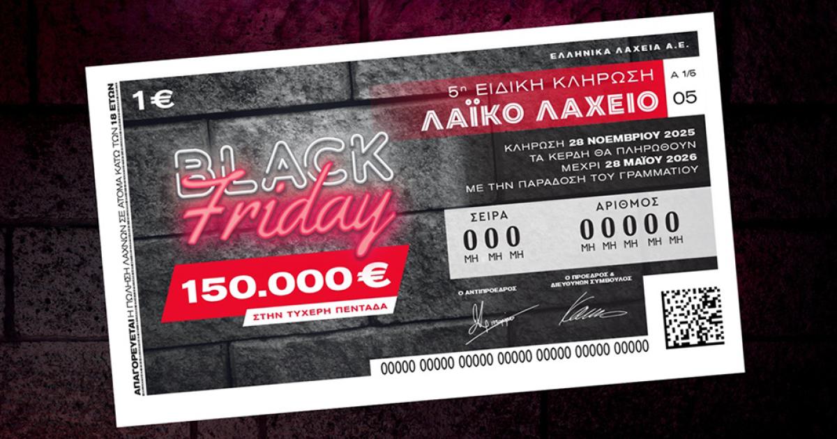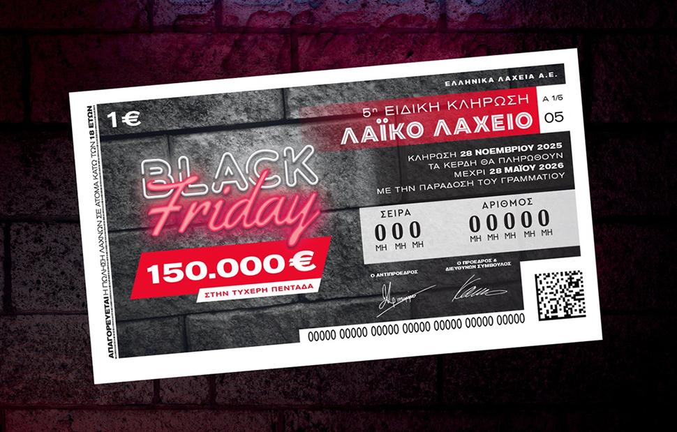 Λίγες ημέρες απομένουν για την ειδική κλήρωση Black Friday του Λαϊκού Λαχείου, με το παιχνίδι του ΟΠΑΠ να μοιράζει 150.000 ευρώ στον μεγάλο νικητή της ειδικής κλήρωσης, που θα πραγματοποιηθεί την Παρασκευή 28 Νοεμβρίου.
