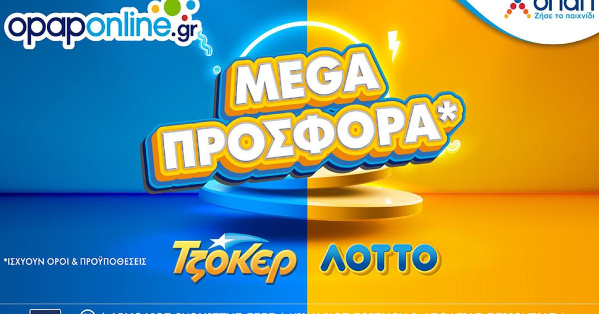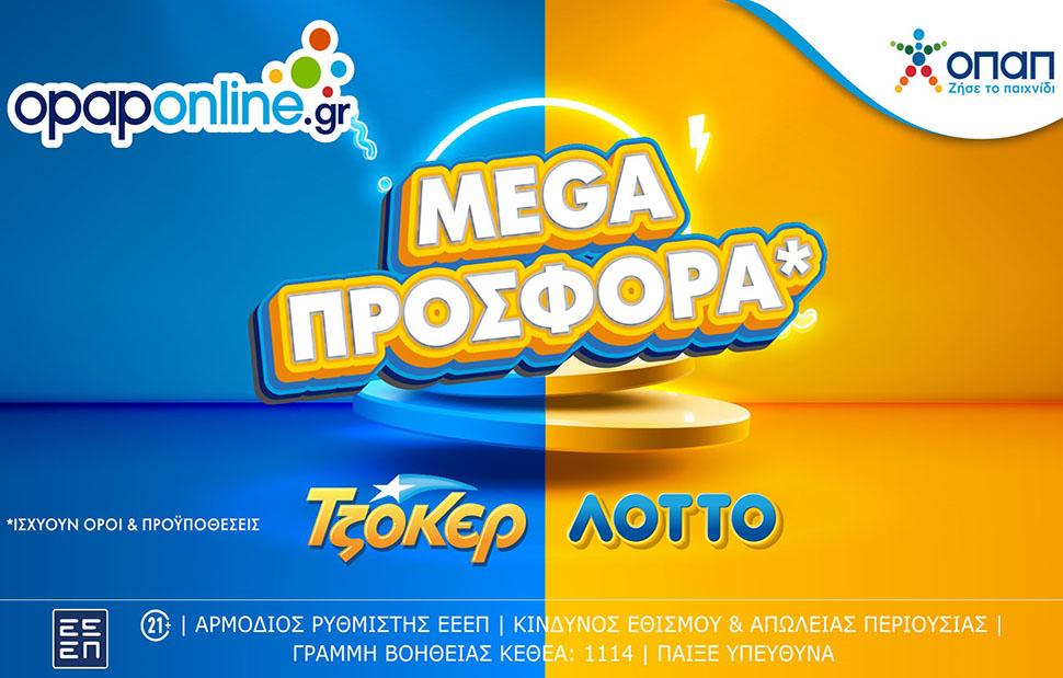 Μία mega προσφορά για τη συμμετοχή στις κληρώσεις του ΤΖΟΚΕΡ και του ΛΟΤΤΟ περιμένει όλους τους διαδικτυακούς παίκτες στο opaponline.gr και την εφαρμογή Opaponline App. Παράλληλα, για όλους τους νέους χρήστες, υπάρχει επιπλέον διαθέσιμη διπλή προσφορά* γνωριμίας.