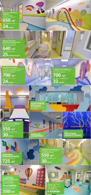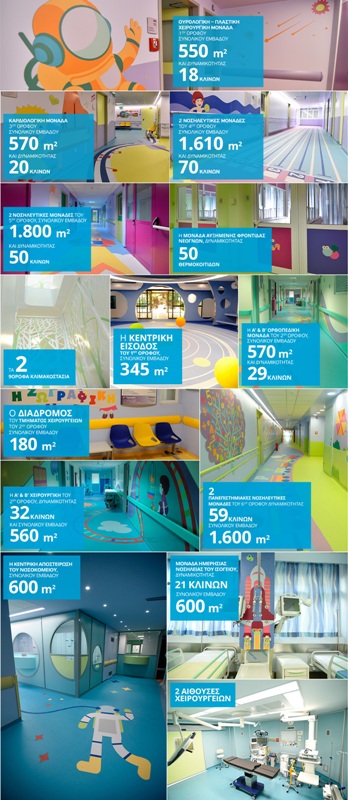 Στο πλαίσιο του έργου ανακαίνισης, τα παιδιατρικά νοσοκομεία «Η Αγία Σοφία» και «Παναγιώτης και Αγλαΐα Κυριακού» έχουν εφοδιαστεί με τον απαραίτητο γραφειακό και ξενοδοχειακό εξοπλισμό. Επιπλέον, οι ηλεκτρομηχανολογικές εγκαταστάσεις και τα συστήματα κλιματισμού, θέρμανσης και εξαερισμού έχουν εκσυγχρονιστεί πλήρως, και έχουν πραγματοποιηθεί εκτενείς αισθητικές παρεμβάσεις, οι οποίες δημιουργούν ένα ευχάριστο θεραπευτικό περιβάλλον για τα παιδιά.