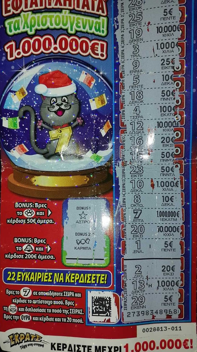 Το κόστος του τυχερού λαχνού ΣΚΡΑΤΣ, που έκανε εκατομμυριούχο τον μεγάλο νικητή, ήταν 10 ευρώ. Όπως αναφέρει ο κος Παπαχριστοφίλου, «ο τυχερός παίκτης σκράτσαρε μία-μία τις περιοχές και βρήκε τον αριθμό 7. Όταν εμφανίστηκε το ποσό του 1 εκατ. ευρώ ακριβώς δίπλα πάγωσε. Μου έδωσε τον λαχνό και μου είπε να το τσεκάρω. Σκάναρα το QR code του τυχερού ΣΚΡΑΤΣ στο OPAP Store App στο κινητό μου και όταν είδαμε το ποσό του κέρδους στην οθόνη, ξεκίνησαν τα... πανηγύρια μέσα στο μαγαζί».