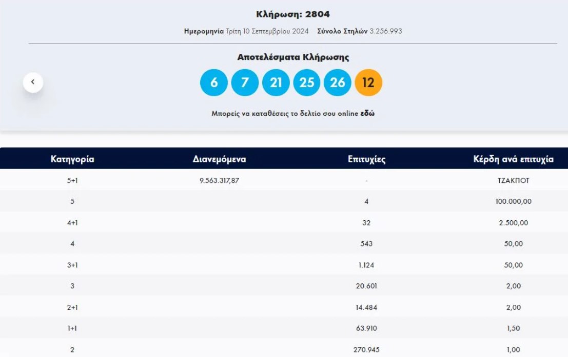 Τζακ ποτ σημειώθηκε στην πρώτη κατηγορία του Τζόκερ στην κλήρωση 2804 της Τρίτης.