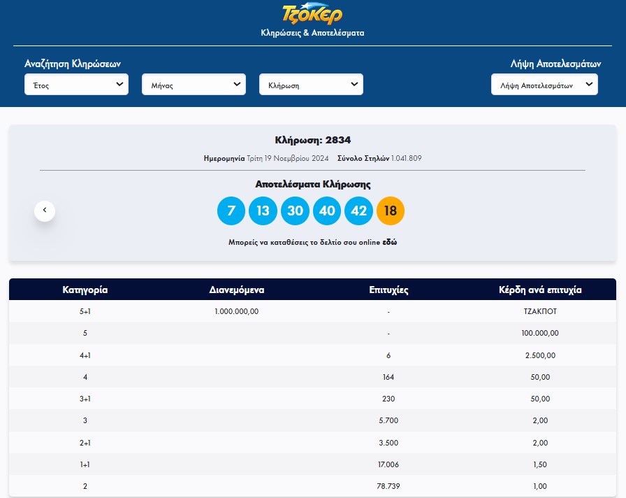 Τζακ ποτ σημειώθηκε στην πρώτη κατηγορία του Τζόκερ στην κλήρωση 2834 της Τρίτης.