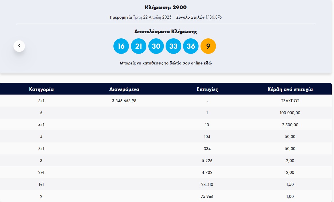 Οι αριθμοί που κερδίζουν είναι οι εξής: 16, 21, 30, 33, 36 και Tζόκερ ο αριθμός: 9