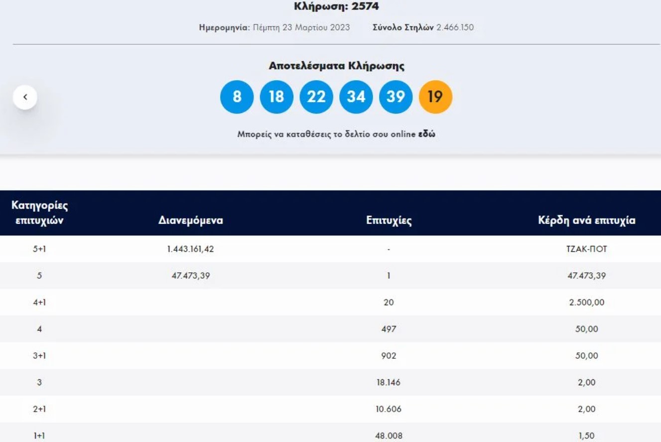 Τζακ ποτ σημειώθηκε στην πρώτη κατηγορία (5+1) του Τζόκερ στην κλήρωση 2574 της Τρίτης.