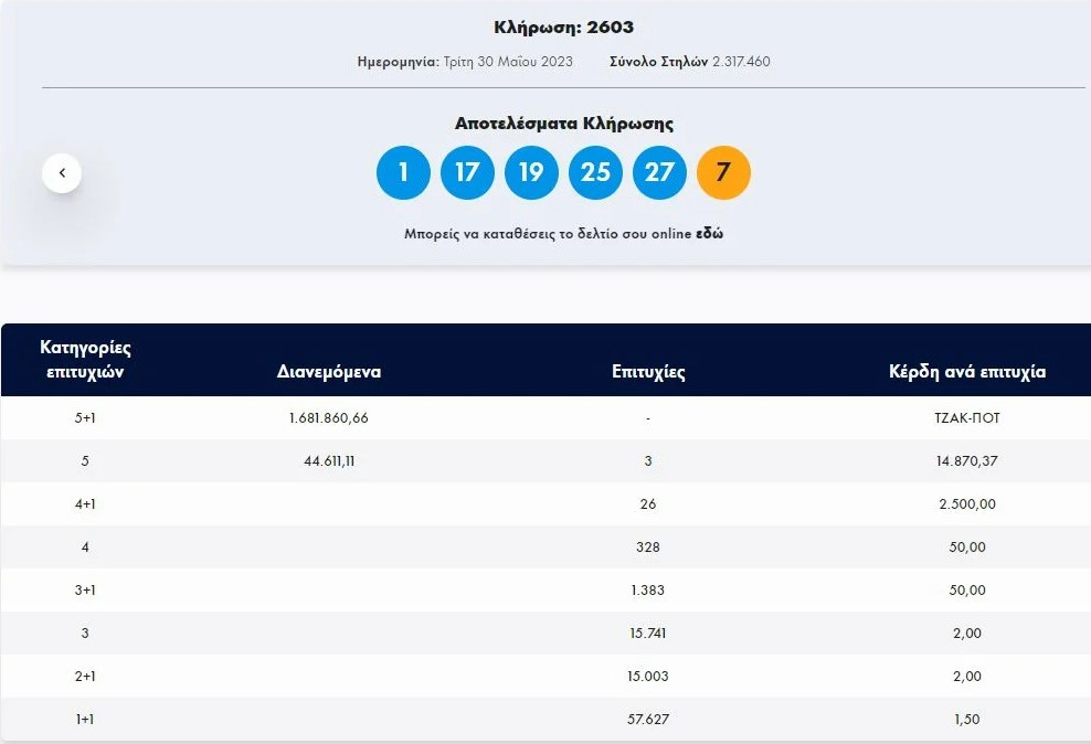 Τζακ ποτ σημειώθηκε στην πρώτη κατηγορία (5+1) του Τζόκερ στην κλήρωση 2603 της Τρίτης.