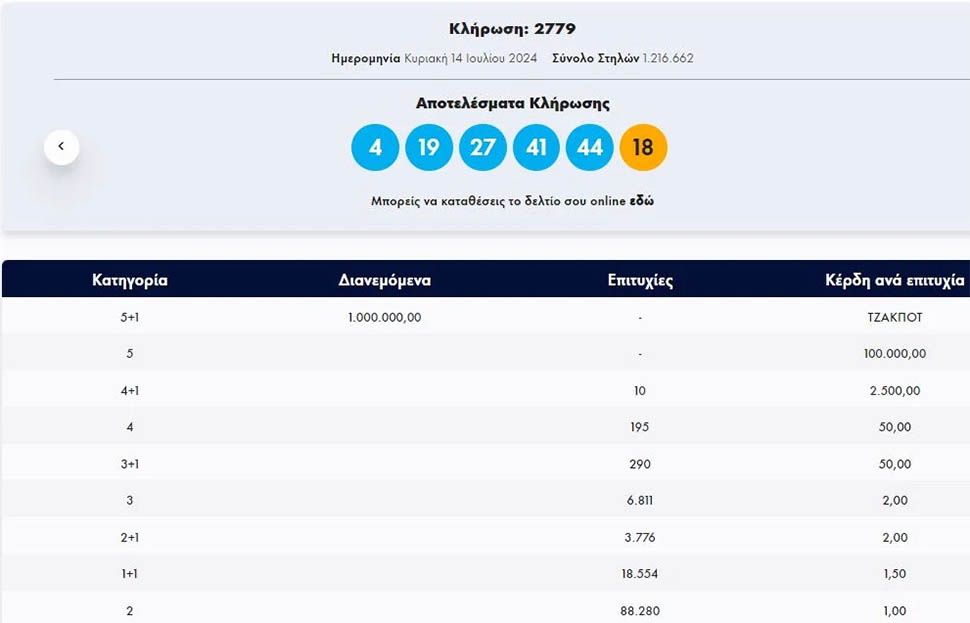Τζακ ποτ σημειώθηκε στην πρώτη κατηγορία (5+1) του Τζόκερ στην κλήρωση 2779 της Κυριακής.