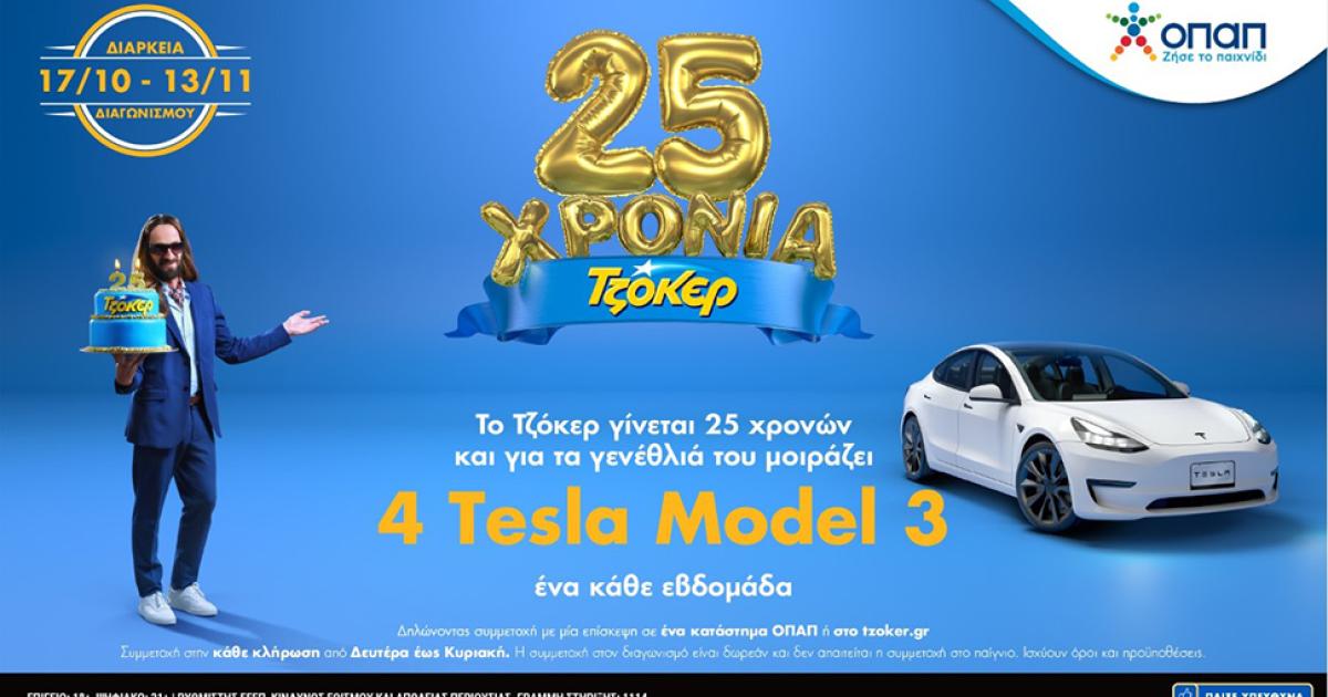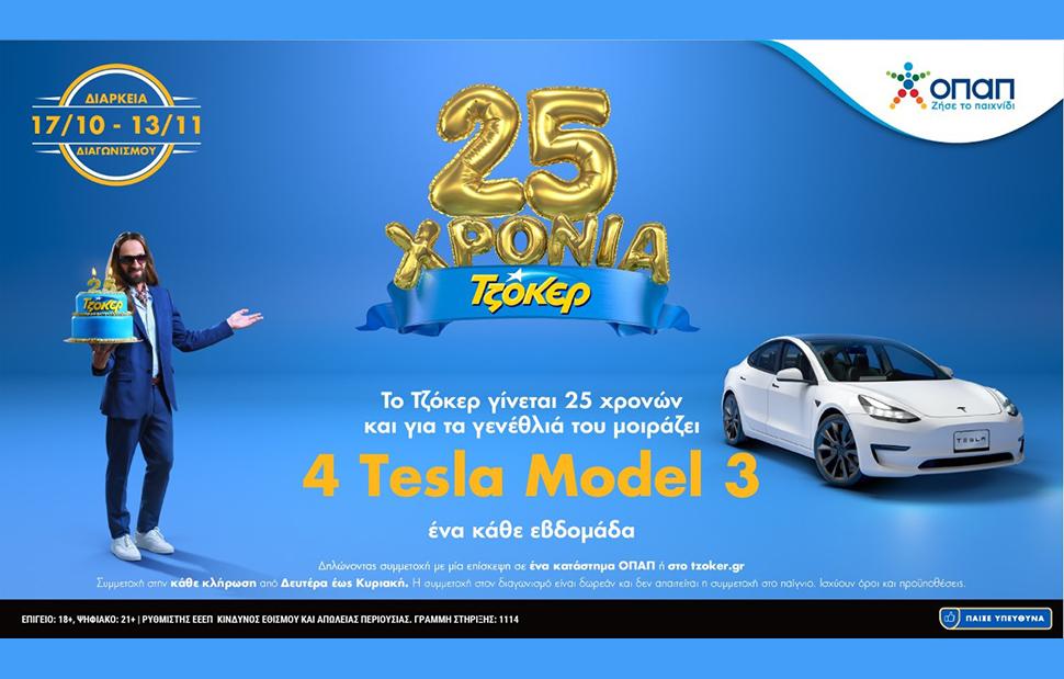 Το ΤΖΟΚΕΡ γίνεται 25 χρόνων και γιορτάζει τα γενέθλιά του μοιράζοντας 4 αυτοκίνητα TESLA Model 3. Από τις 17 Οκτωβρίου έως και τις 13 Νοεμβρίου, 4 τυχεροί θα κερδίσουν από ένα αυτοκίνητο, σε 4 συνεχόμενες εβδομαδιαίες κληρώσεις. Για να συμμετάσχει κάποιος στην κλήρωση, το μόνο που χρειάζεται να κάνει είναι να επισκεφθεί ένα κατάστημα ΟΠΑΠ ή την ιστοσελίδα tzoker.gr. Η συμμετοχή στις εβδομαδιαίες κληρώσεις γίνεται εντελώς δωρεάν, αφού δεν απαιτείται να παίξει κάποιος ΤΖΟΚΕΡ ή οποιοδήποτε άλλο παιχνίδι προκειμένου να πάρει μέρος.
