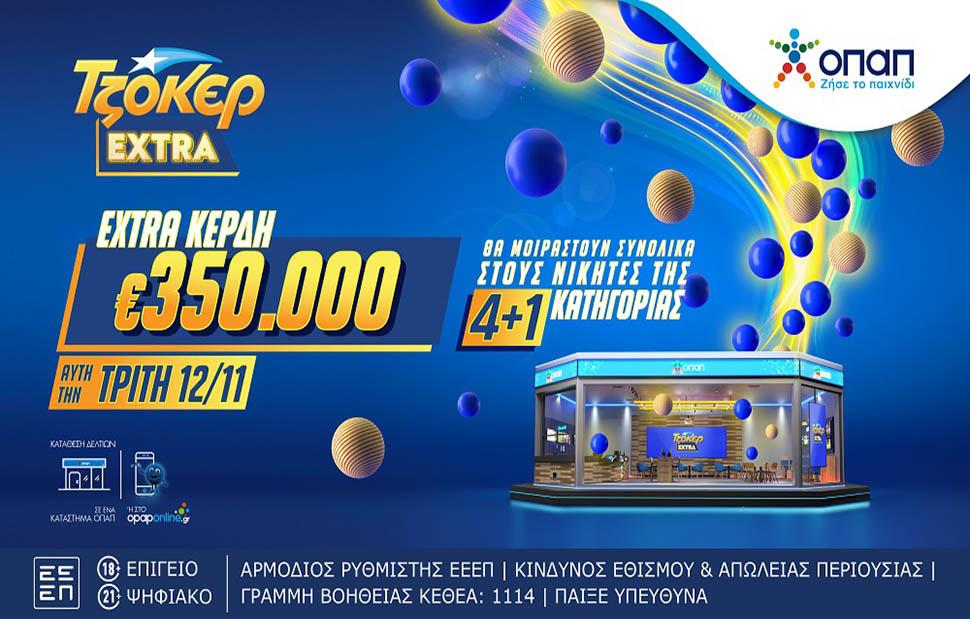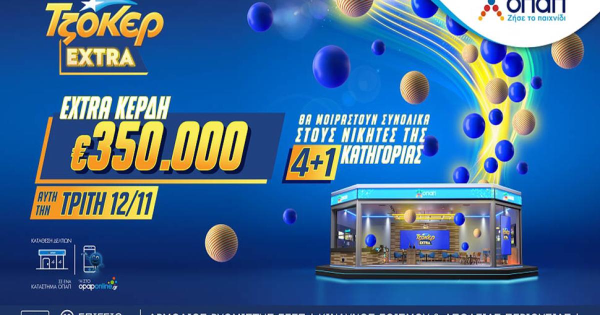 Την ευκαιρία να διεκδικήσουν επιπλέον κέρδη έχουν αυτή την εβδομάδα οι παίκτες του ΤΖΟΚΕΡ, καθώς το δημοφιλές παιχνίδι του ΟΠΑΠ θα μοιράσει συνολικά πάνω από 1 εκατ. ευρώ στους νικητές της κατηγορίας 4+1. Το ΤΖΟΚΕΡ extra, ο νέος μηχανισμός απόδοσης επιπλέον κερδών, ξεκινά από την αποψινή κλήρωση στις 22:00, με τους νικητές της τρίτης κατηγορίας να μοιράζονται extra 350.000 ευρώ.