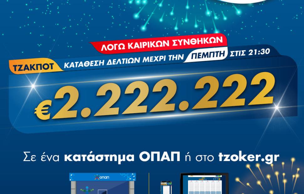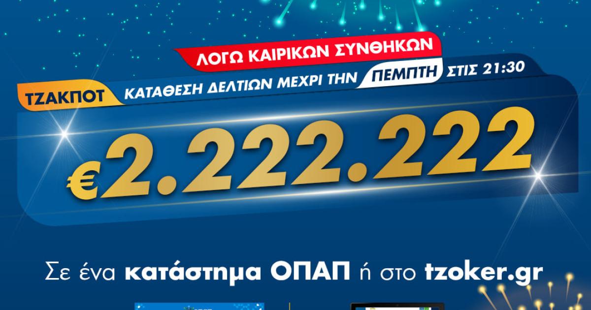 Ο αριθμός «2» πρωταγωνιστεί στην αποψινή κλήρωση του ΤΖΟΚΕΡ, η οποία αναμένεται να μοιράσει 2.222.222 ευρώ στην πρώτη κατηγορία. Όσοι θέλουν να διεκδικήσουν το μεγάλο έπαθλο του παιχνιδιού μπορούν να καταθέσουν το δελτίο τους ακόμη και από το σπίτι τους, μέσω του tzoker.gr ή της εφαρμογής ΤΖΟΚΕΡ.