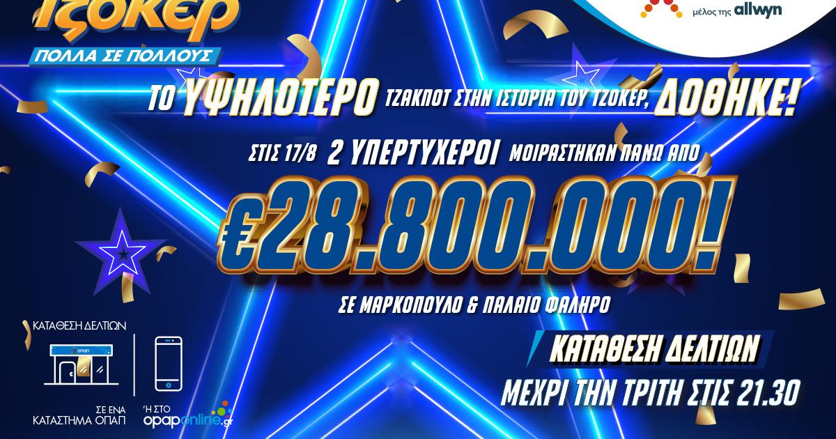 Το απόλυτο ρεκόρ στο ΤΖΟΚΕΡ – Κληρώνει 28,5 εκατ. ευρώ απόψε στις 22:00