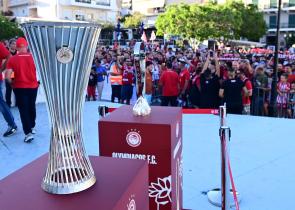 Χιλιάδες φίλοι του Ολυμπιακού έβγαλαν φωτογραφίες και βίντεο με τις κούπες του Conference και Youth League.