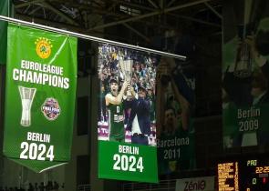 Ο Παναθηναϊκός γιόρτασε την κατάκτηση του έβδομου ευρωπαϊκού του τροπαίου προσθέτοντας και σχετικό λάβαρο στην οροφή του ΟΑΚΑ.