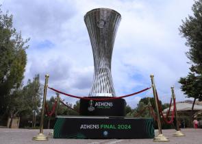 Ο δήμαρχος Αθηναίων, Χάρης Δούκας, ο πρόεδρος της ΕΠΟ, Παναγιώτης Μπαλτάκος και ο πρεσβευτής του Europa Conference League, Τραΐανός Δέλλας μετέφεραν τ...