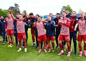 Οι «χρυσοί» νέοι του Ολυμπιακού διέλυσαν τους «ροσονέρι» μέσα σε έξι λεπτά, με γκολ των Μουζακίτη, Παπακανέλλου και Μπακούλα, μπροστά στην ελίτ της Ευ...
