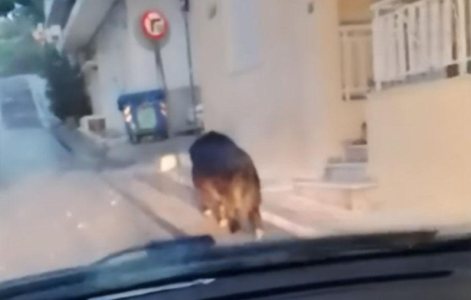 Όπως φαίνεται και στο βίντεο που δημοσίευσε ο χρήστης στο TikTok, το άγριο ζώο κόβει βόλτες σε δρόμο της περιοχής και στη συνέχεια ανεβαίνει στο πεζοδρόμιο και στρίβει.