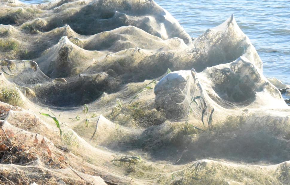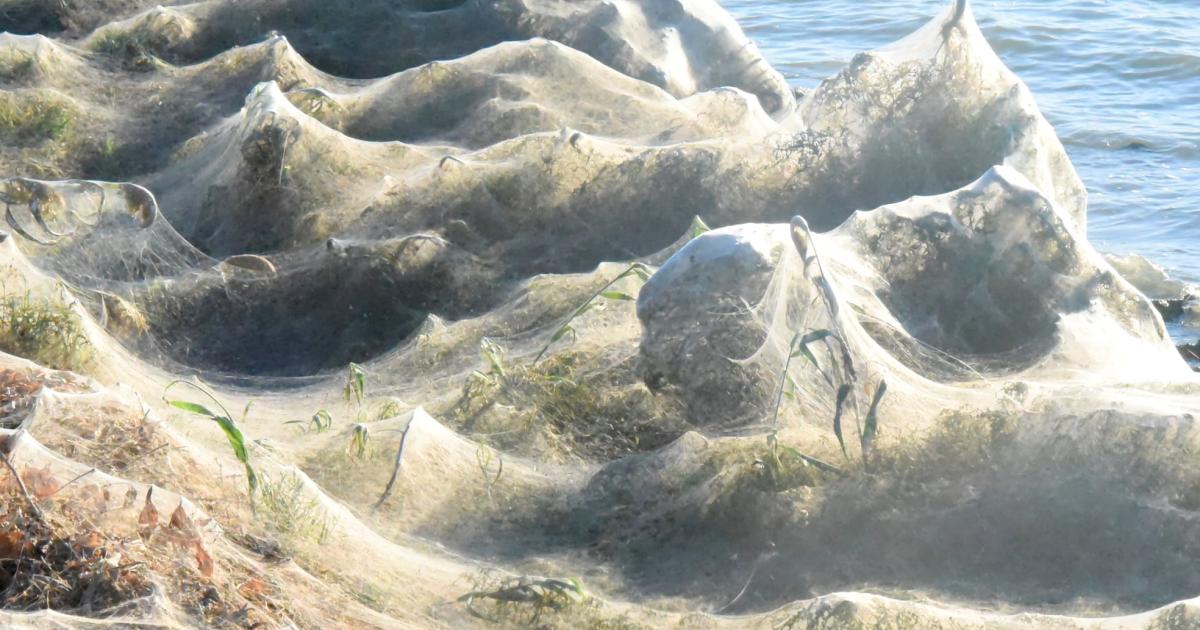 Tεράστιο πέπλο από αράχνες έχει καλύψει τα φυτά σε μήκος 300 μέτρων στην ανατολική παραλία της λιμνοθάλασσας στο Αιτωλικό.
