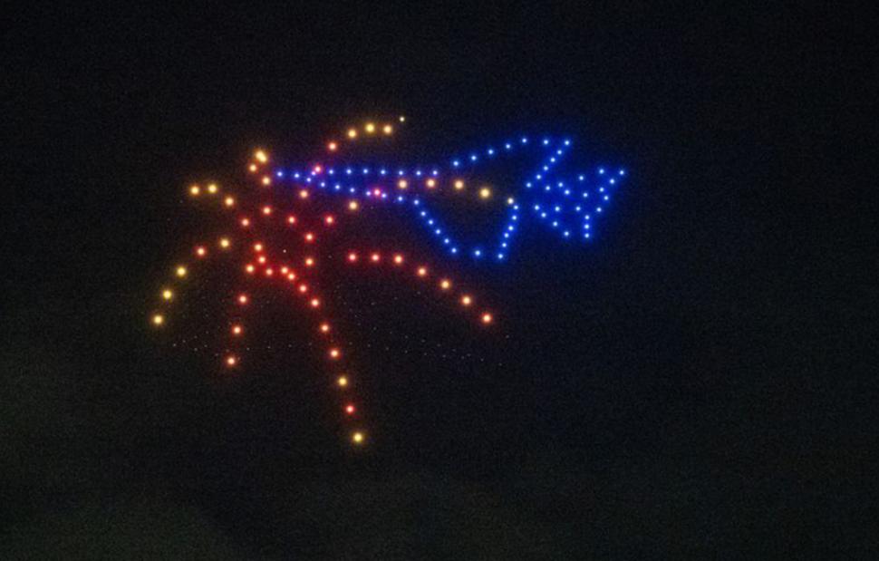Η εντυπωσιακότερη στιγμή ήταν αυτή που ένα μπλε «μαχητικό» από drones (σ.σ. τα χρώματα της Ελλάδας) κατέρριψε ένα αντίστοιχο κόκκινου χρώματος (σ.σ. τα χρώματα της Τουρκίας).