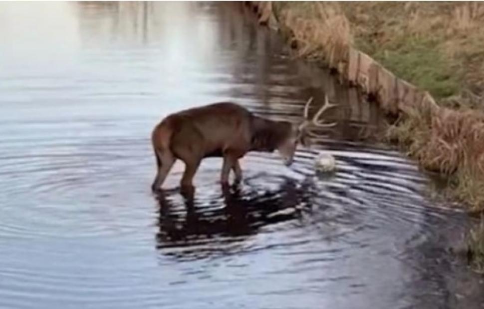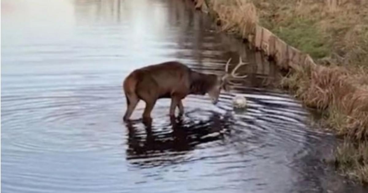 Το ελάφι έσπρωχνε την μπάλα με τη μύτη του κατά μήκος του ποταμού, χρησιμοποιώντας και τα κέρατά του. Μια γυναίκα απαθανάτισε το βίντεο κάνοντας βόλτα στο πάρκο του Λονδίνου.