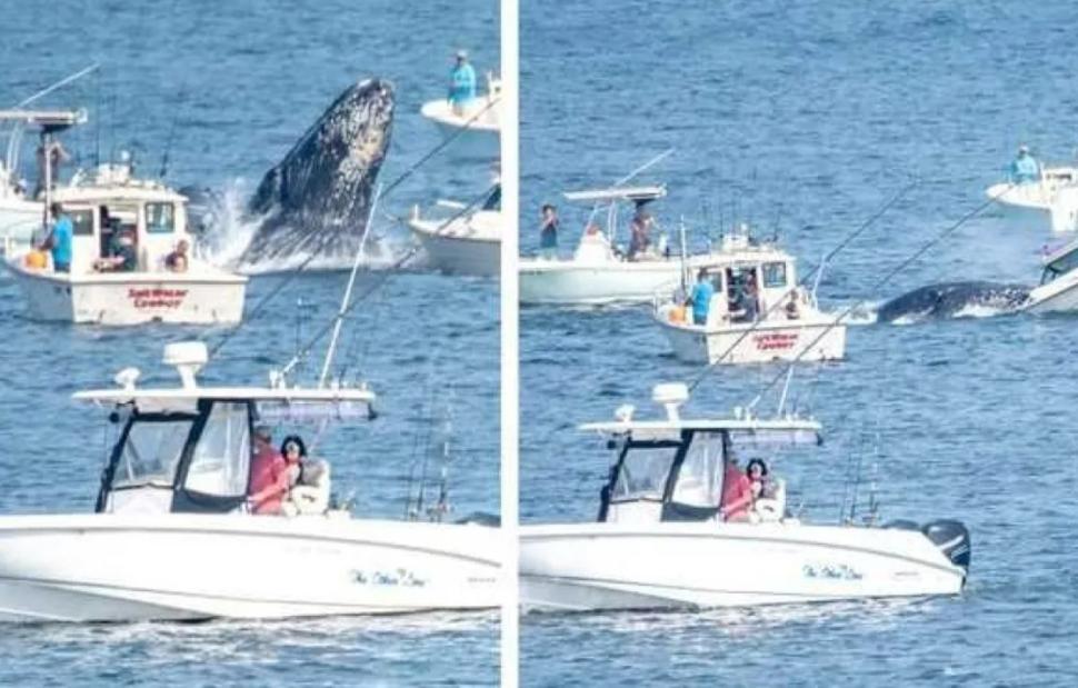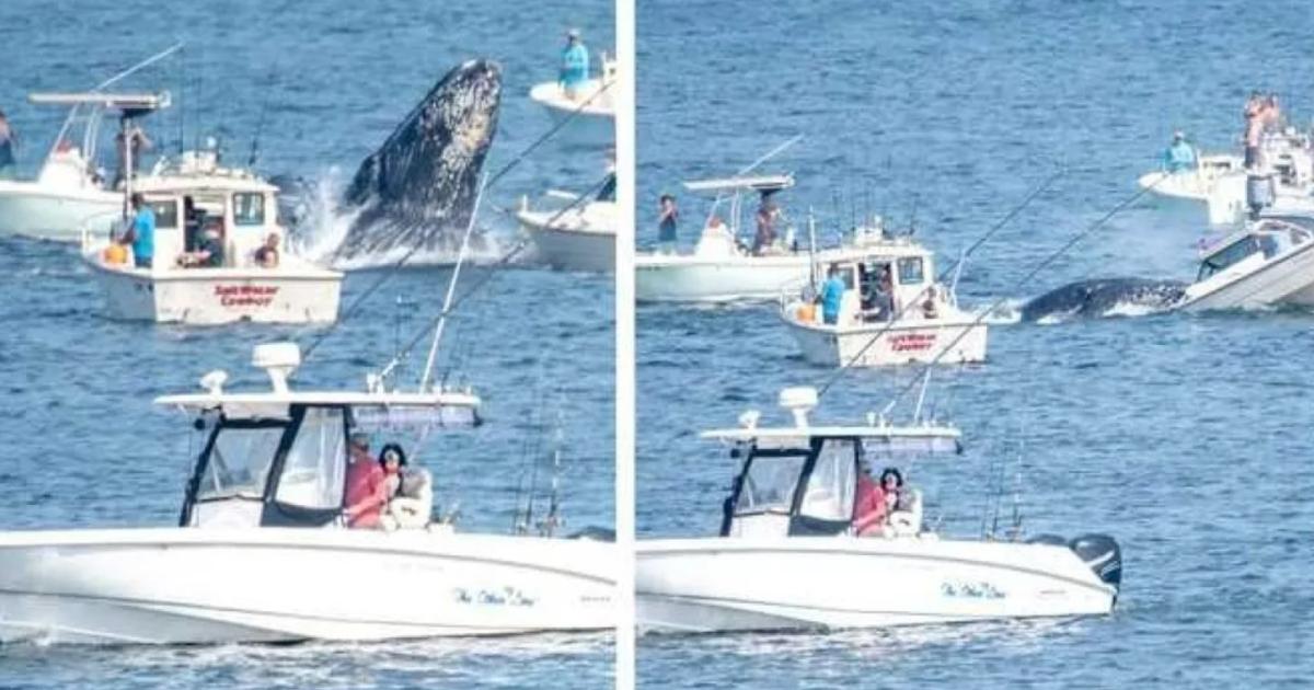 Whale watchers were treated to extraordinary scenes as a humpback whale landed on a small boat 🐋🛥️