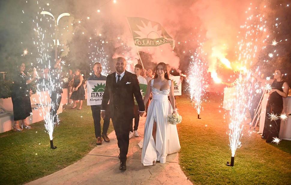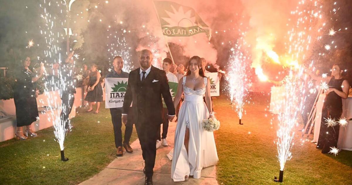 Με καπνογόνα, βεγγαλικά και σημαίες του ΠΑΣΟΚ να κυματίζουν, το ζευγάρι έκανε την είσοδό του υπό τους ήχους του εμβληματικού τραγουδιού «Καλημέρα ήλιε», δημιουργώντας μια ατμόσφαιρα που θα μείνει αξέχαστη σε όλους τους παρευρισκόμενους.