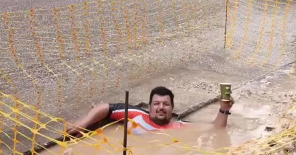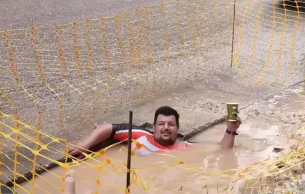 Στο βίντεο που δεν άργησε να γίνει viral, φαίνεται να παίρνει τον καφέ του και μαζί με την κλασική φουσκωτή μπανάνα να βουτάει σε μια «πισίνα» που δημιουργήθηκε στον δρόμο σε λακκούβα έργων.