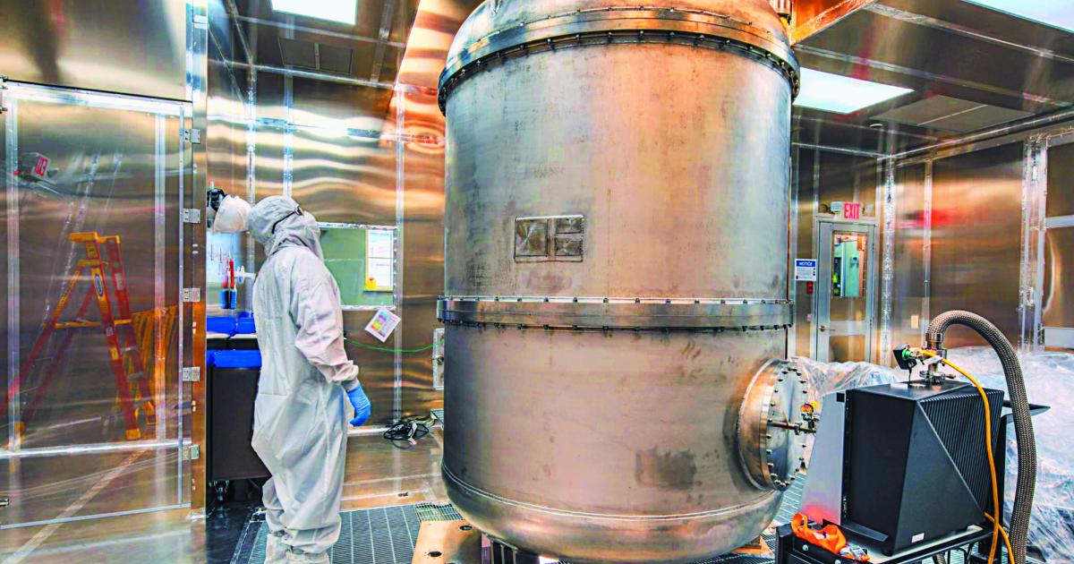 Σχεδόν 1,5 χιλιόμετρο κάτω από την επιφάνεια του εδάφους στο Σάνφορντ της Νότιας Ντακότα, θωρακισμένος από γνωστές πηγές ακτινοβολίας, ο ανιχνευτής LUX-ZEPLIN βασίζεται σε μια γιγάντια δεξαμενή (εικόνα) που περιέχει επτά τόνους υγρού ξένου.