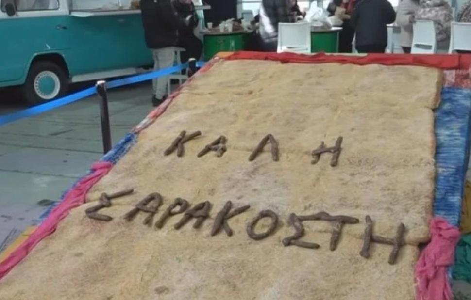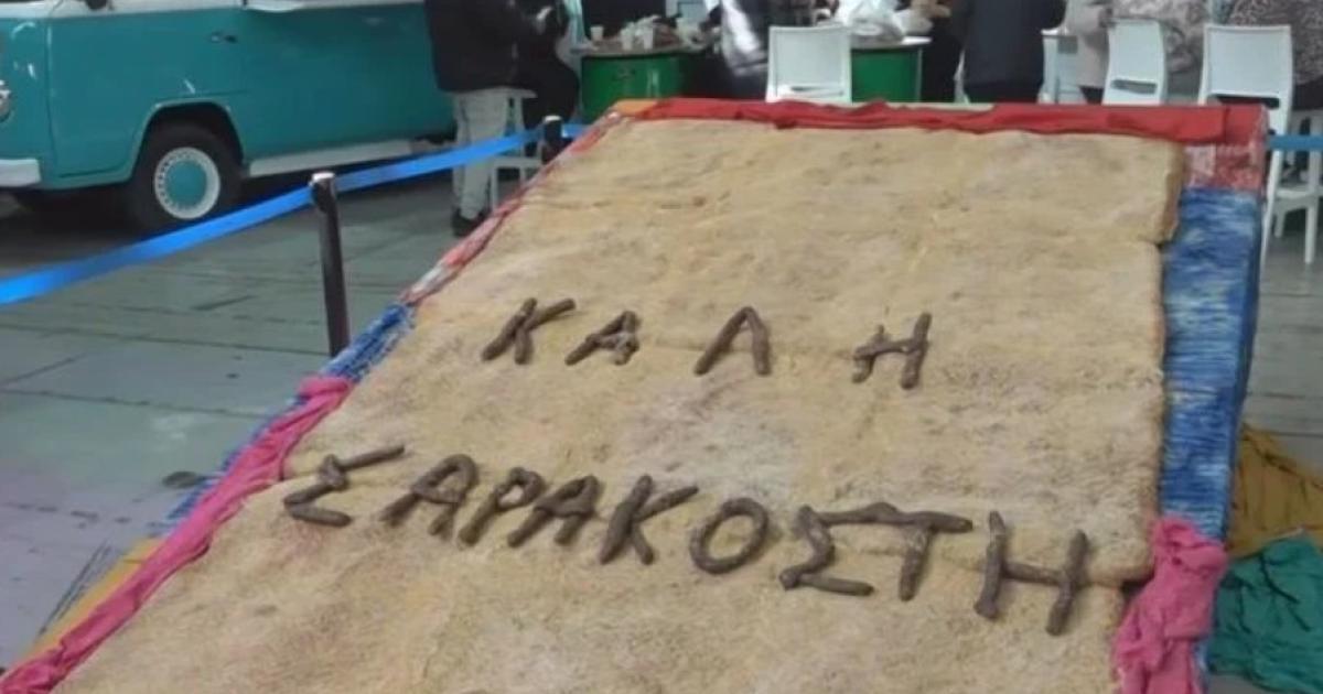 Η λαγάνα-γίγας μεταφέρθηκε με γερανό στο χώρο της εκδήλωσης και είναι δημιούργημα της Συντεχνίας Αρτοποιών Αθηνών και Προαστίων.