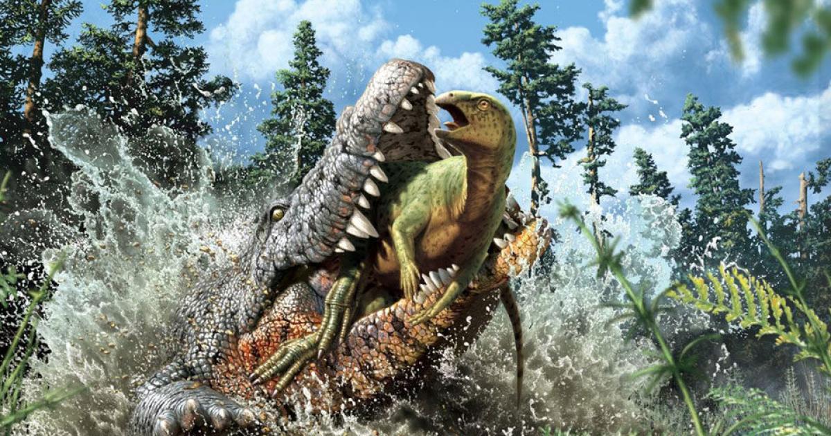 Μέσα στο στομάχι του μήκους 2,5 μέτρων κροκόδειλου, οι επιστήμονες ανακάλυψαν ένα μερικώς διατηρημένο -λόγω ημιτελούς πέψης- νεαρό δεινόσαυρο.