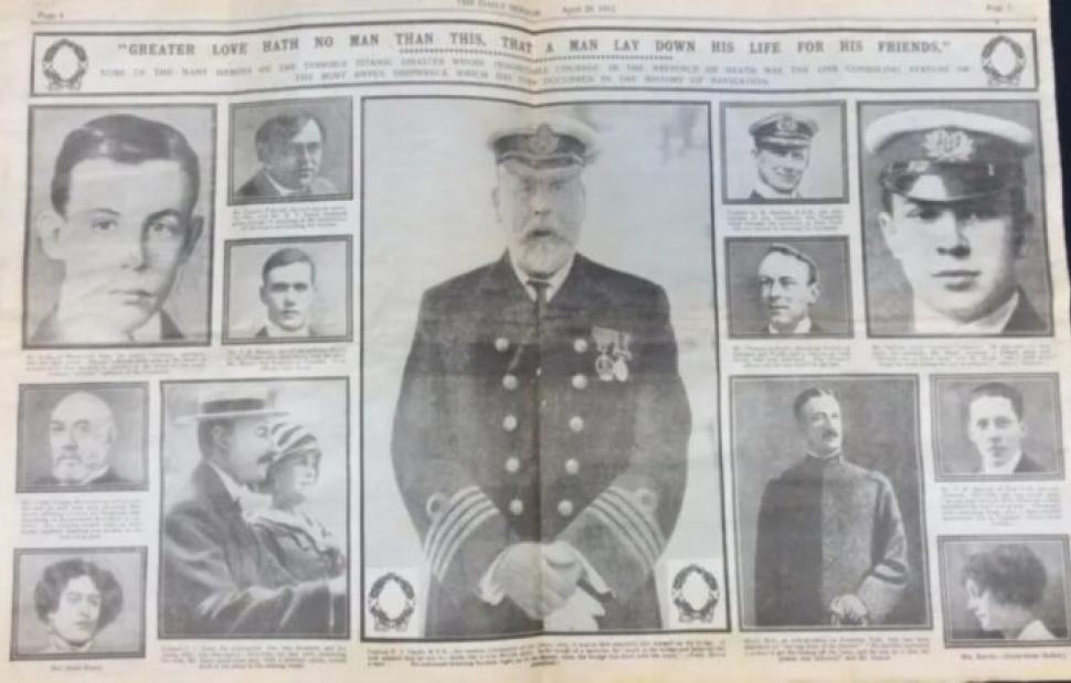 Το πρωτοσέλιδο της βρετανικής εφημερίδας The Daily Mirror, το οποίο δημοσιεύθηκε στις 20 Απριλίου 1912, δείχνει δύο γυναίκες στο Σαουθάμπτον – το λιμάνι από όπου απέπλευσε ο Τιτανικός – να περιμένουν να αναρτηθεί η λίστα με τους επιζώντες.