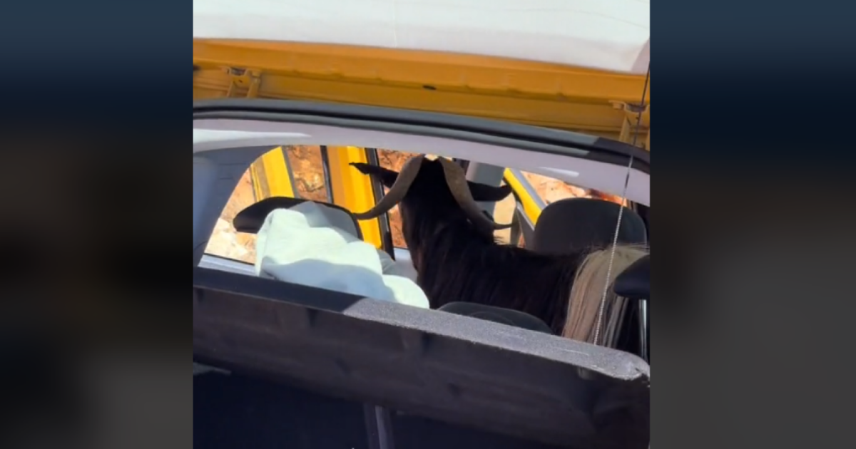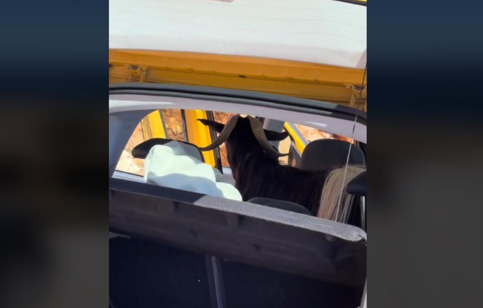 Όπως φαίνεται στο βίντεο που κάνει τον γύρο του διαδικτύου τις τελευταίες ώρες, ο τράγος, όχι απλά τρίπωσε στην πίσω θέση του αυτοκινήτου των τουριστών, αλλά δεν έβγαινε κιόλας.