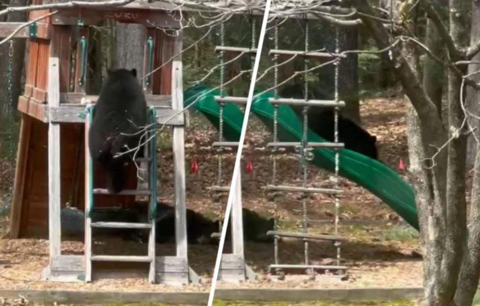 So cute! Watch this bear go down a slide in the backyard of this family's home! 🐻 #Connecticut #AnimalAntics #funnyanimals pic.twitter.com/uvWiOvF0Zs