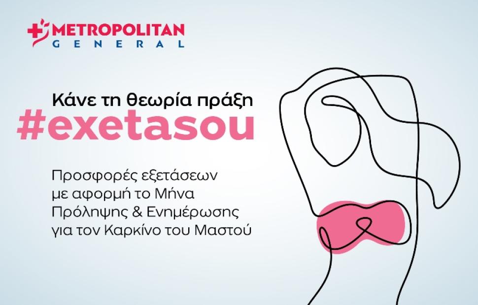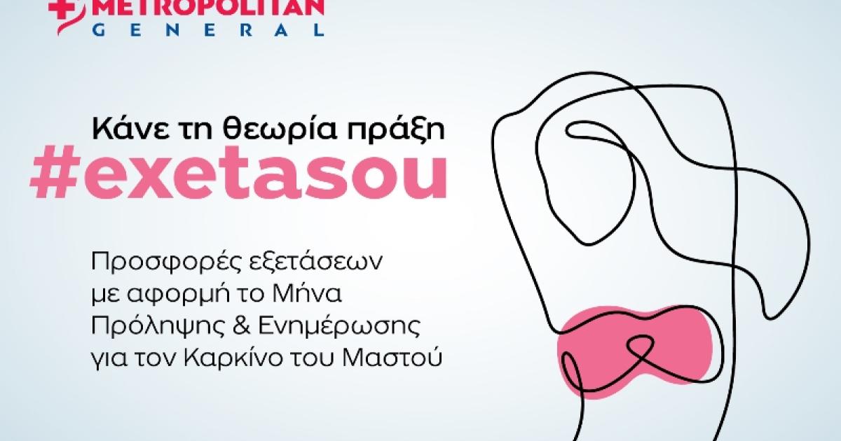 Mε το μήνυμα «Κάνε τη θεωρία πράξη. Εξετάσου», το Metropolitan General, μέλος του HHG, υποδέχεται τον Οκτώβριο, μήνα Πρόληψης και Ενημέρωσης για τον Καρκίνο του Μαστού, με τις παρακάτω προσφορές: