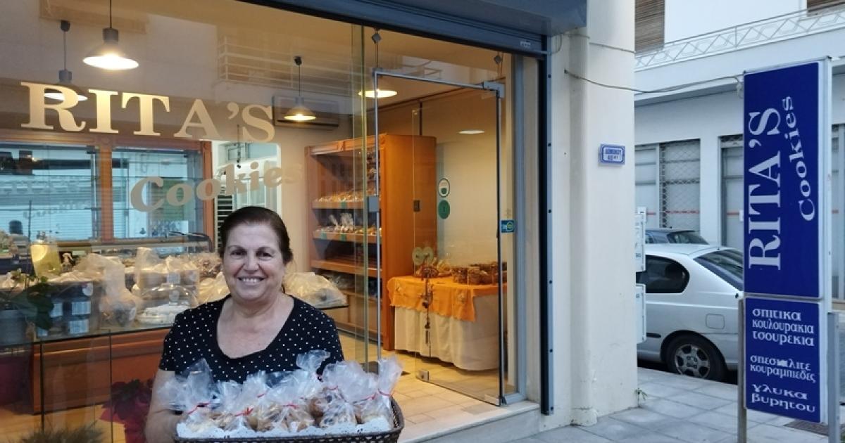 Παρκάραμε το αυτοκίνητο μια κάθετη της Δομοκού και δεν χρειάστηκε να βάλουμε πλοηγό ή να ρωτήσουμε που είναι το Rita’scookies, αφού οι έντονες μαμαδίστικες μυρωδιές που έβγαιναν από τον φούρνο της μας οδήγησαν στο μαγαζί. Εκεί η Ρίτα φορώντας την ποδιά της μας υποδέχθηκε, εκείνη την ώρα καθάριζε ελιές για τις κάνει γέμιση για τα αλμυρά της κουλούρια. Στο πρόσωπο της διακρίνει κανείς μια αυθεντικότητα, μια γυναίκα που ξέρει τις συνταγές της και εκτελώντας τις, μας ταξιδεύει στα παιδικά μας χρόνια. Εκεί όπου περιμέναμε την γιαγιά μας να ξεφουρνίσει τα κουλούρια για να τα δοκιμάσουμε παρότι ζεμάταγαν.