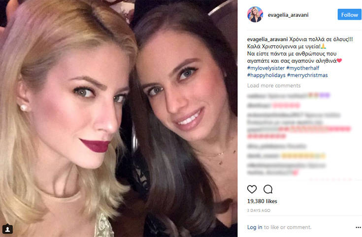 «Χρόνια πολλά σε όλους!!! Καλά Χριστούγεννα με υγεία! Να είστε πάντα με ανθρώπους που αγαπάτε και σας αγαπούν αληθινά», έγραψε η Ευαγγελία ανήμερα των Χριστουγέννων στο Instagram της και ανέβασε μια φωτογραφία με την αδελφή της από τη βραδινή τους έξοδο.